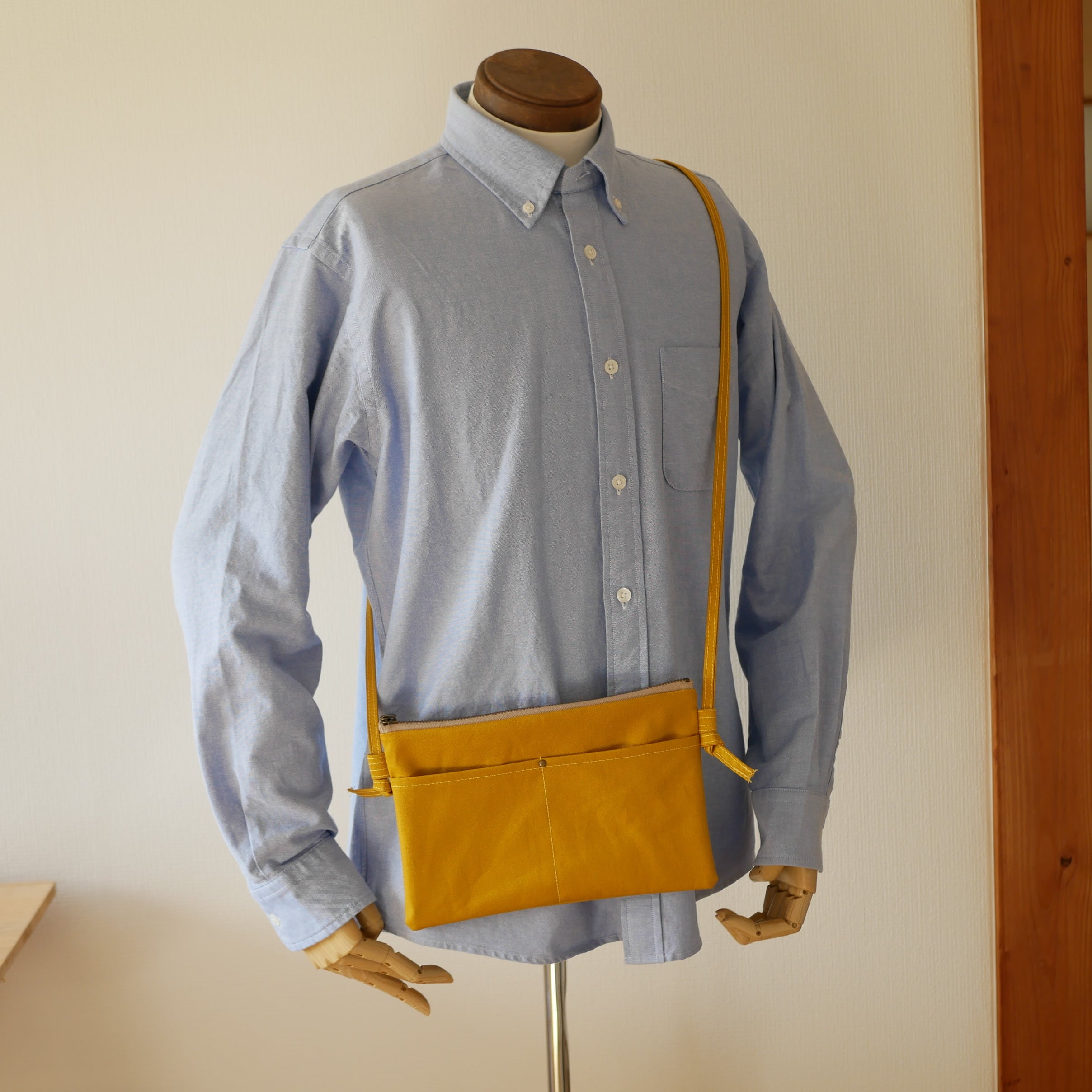 薄手の11号帆布でつくったよこながのサコッシュです。薄手の帆布を使っているので、柔らかい質感でとても軽く、使い勝手の良いサイズです。スマホやキーケース、ワイヤレスイヤホン、お財布など、必要最小限のものがすっぽり入ります。肩ひもは長さを調整できるので、ユニセックスでお使いいただけます。