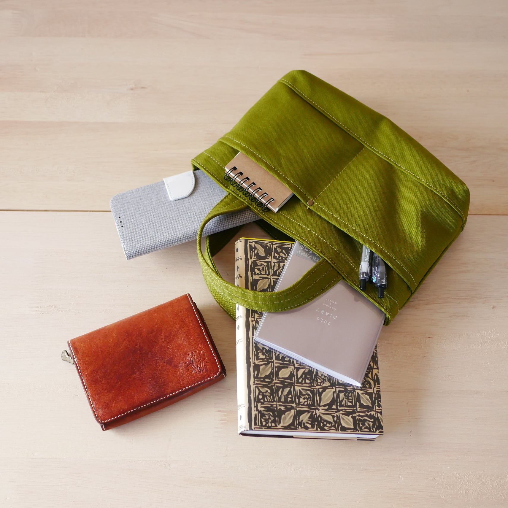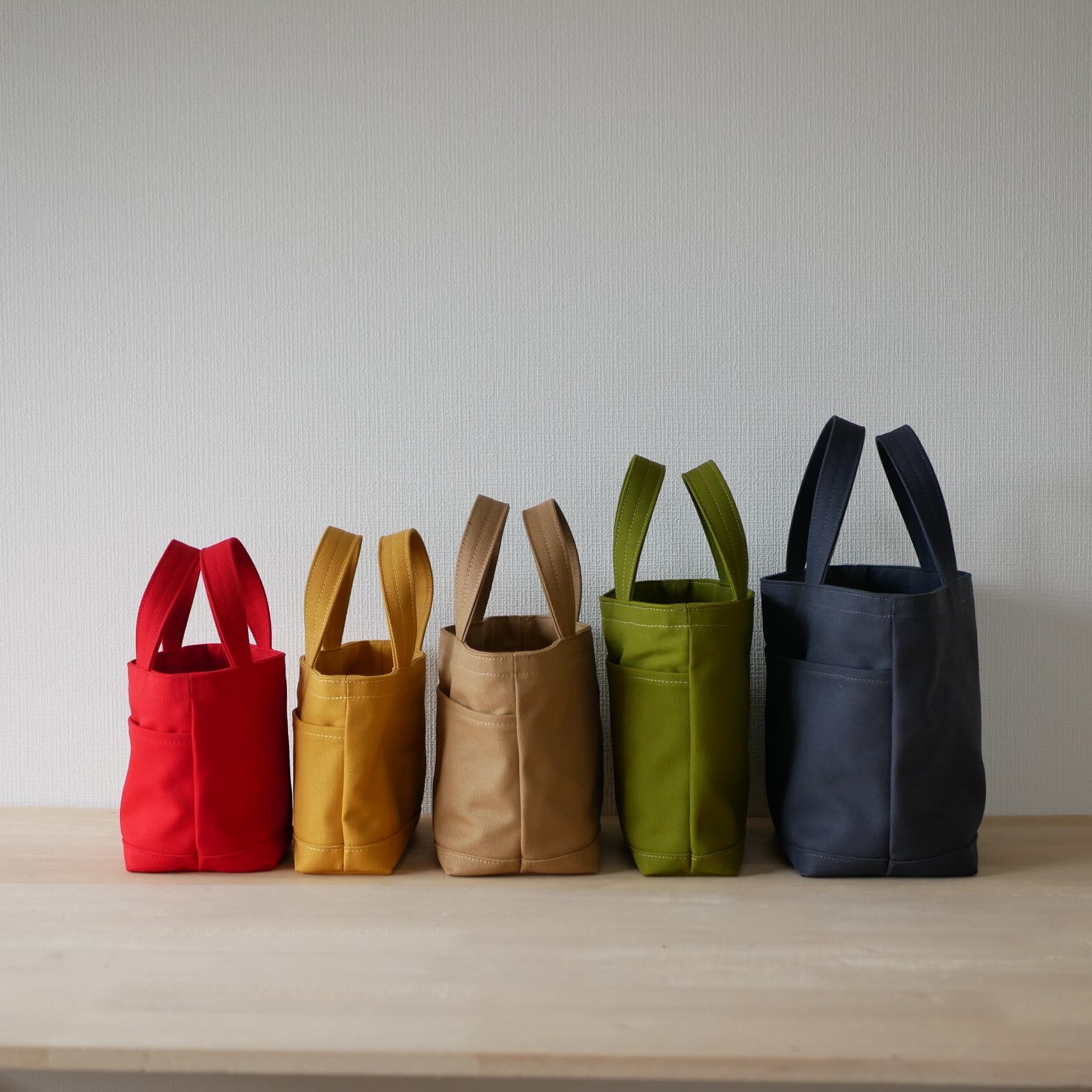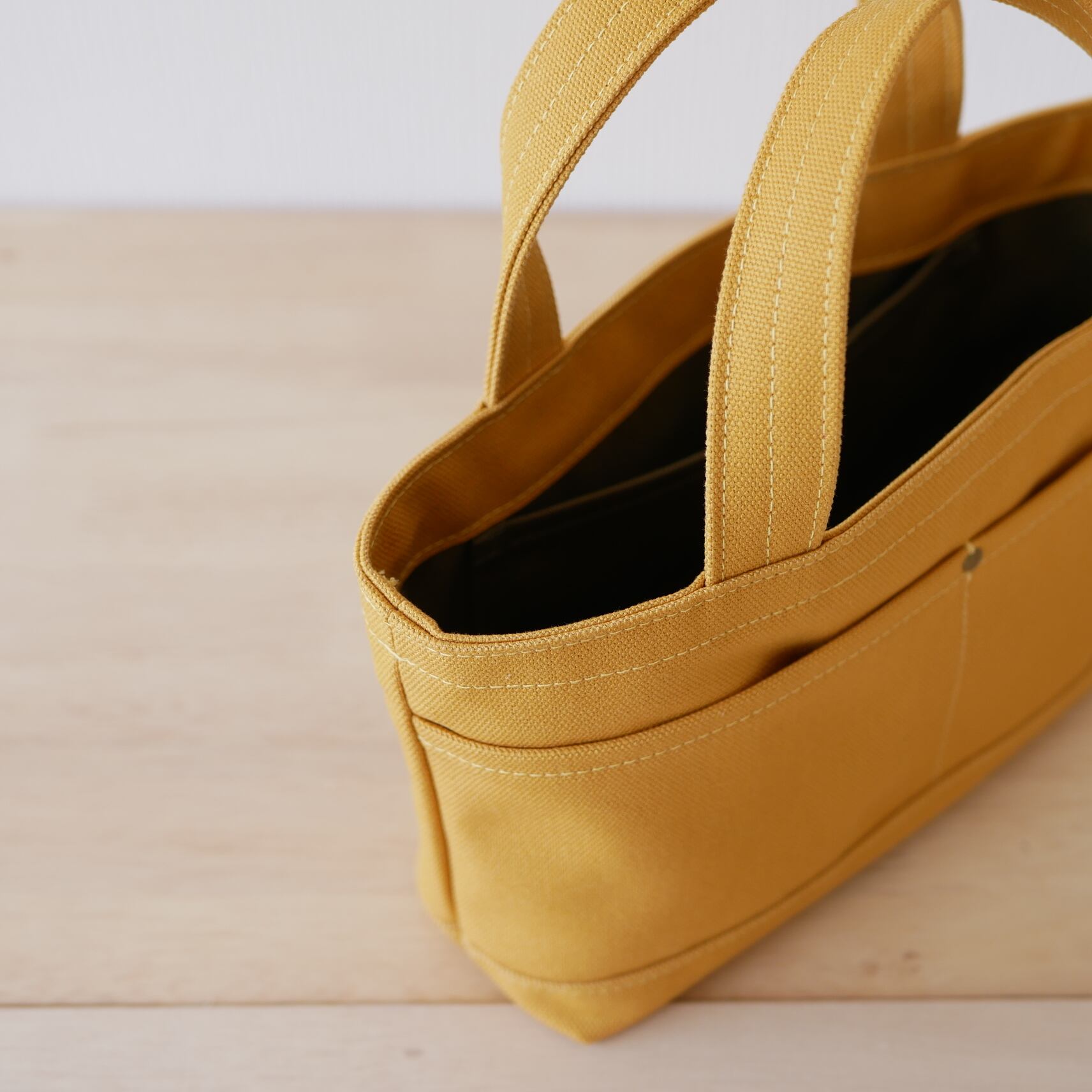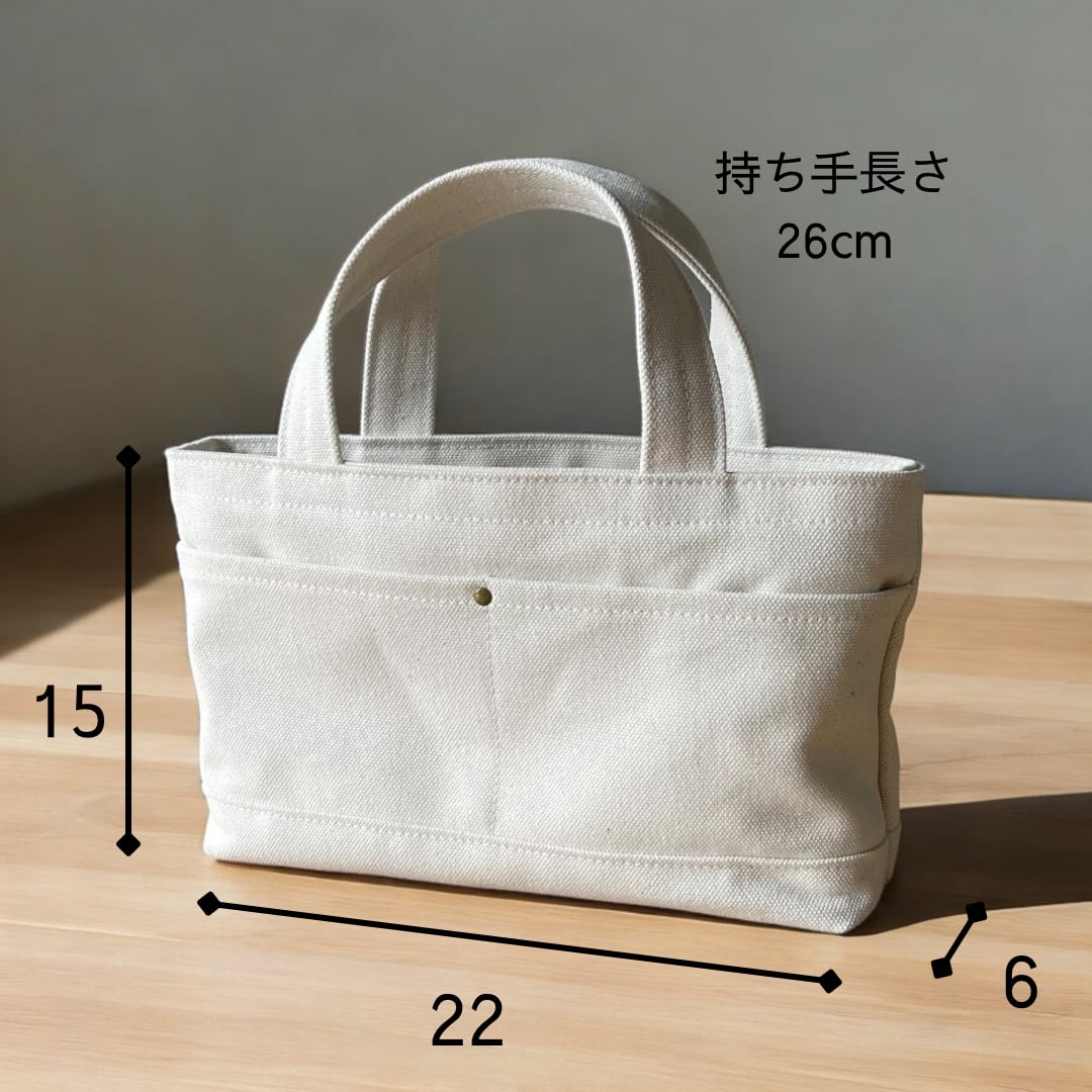 表は厚手の8号帆布を使っており、とても丈夫で自立するかばんになっています。スマホやお財布、カギが入るまち幅なので、ちょっとした外出や通勤用のかばんにちょうど良いサイズです。横幅は長財布が入る大きさにしています。
