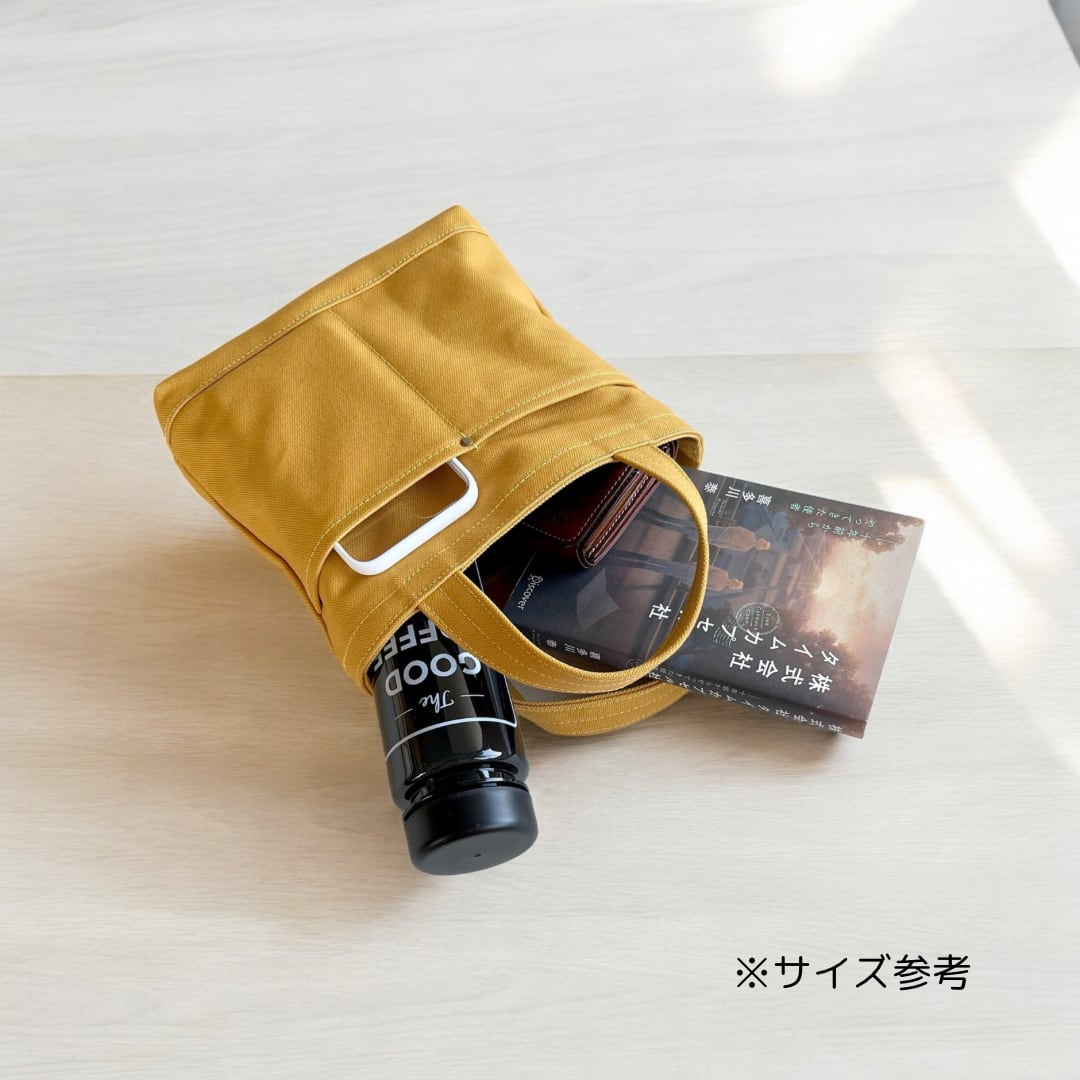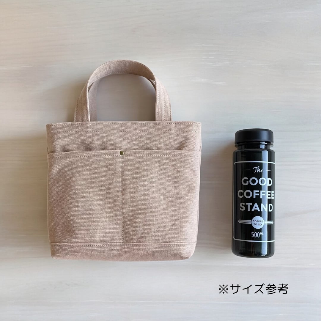 表は厚手の8号帆布を使っており、とても丈夫なつくりになっています。高さは500mlの水筒やペットボトルが入る長さなので、ちょっとしたお出かけの時に使い勝手の良いサイズです。外ポケットと内ポケットは、iPhone14(ケース付き)が入る大きさです。